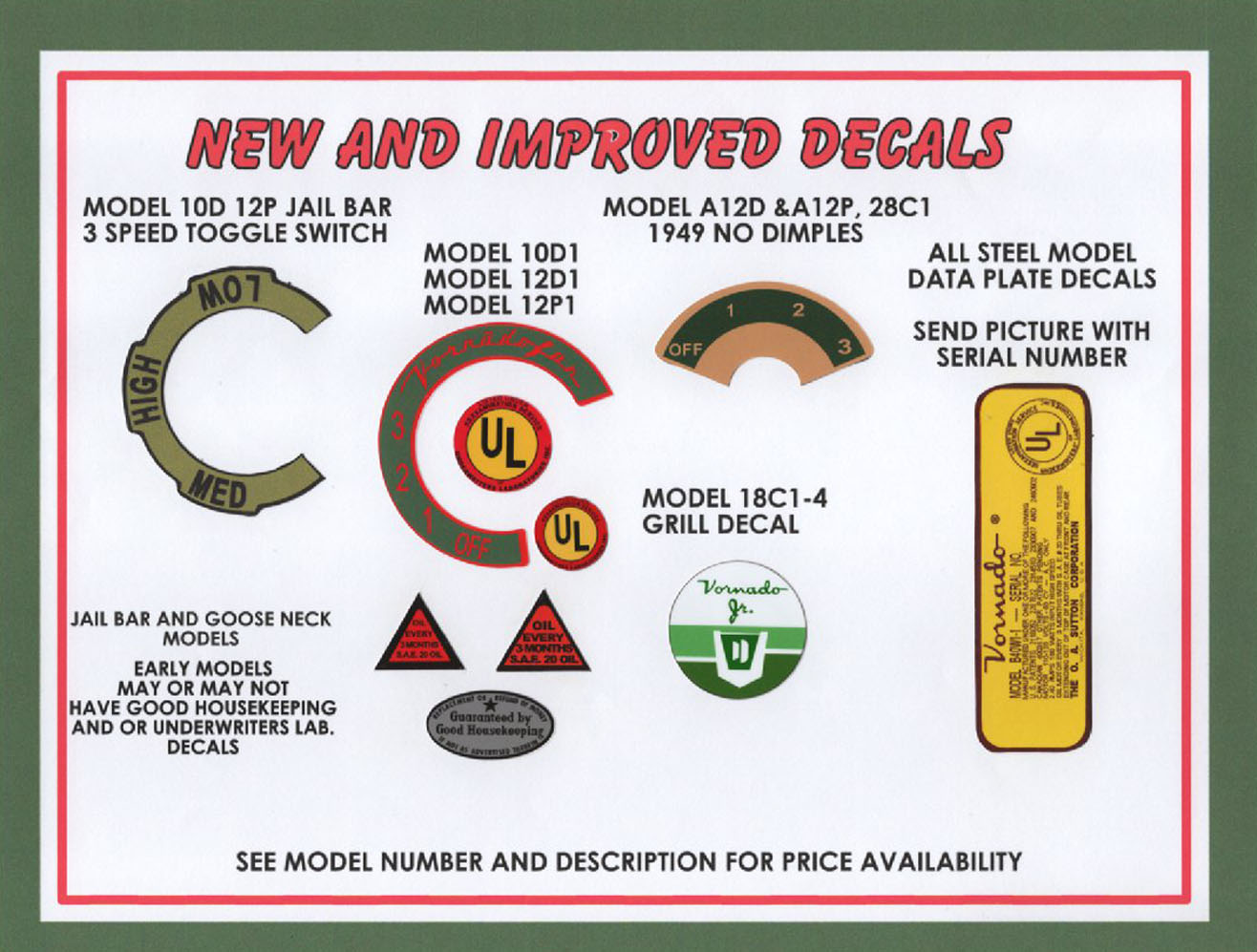 These decal stickers are high resolution and CNC cut to exact sizes as the original factory applied water slide decals. It is important to identify your model and style of existing decals as well as the approximate position they were applied. The early model 10D, 12D and 12P with the jail bar grill were equipped with a 3 speed (position) toggle switch therefore using the gold and black decal (HI, MED, LOW), orange oiling decals (2) plus the UL and maybe Good House Keeping decals. The very early models may or may not have the Good House Keeping seal.
